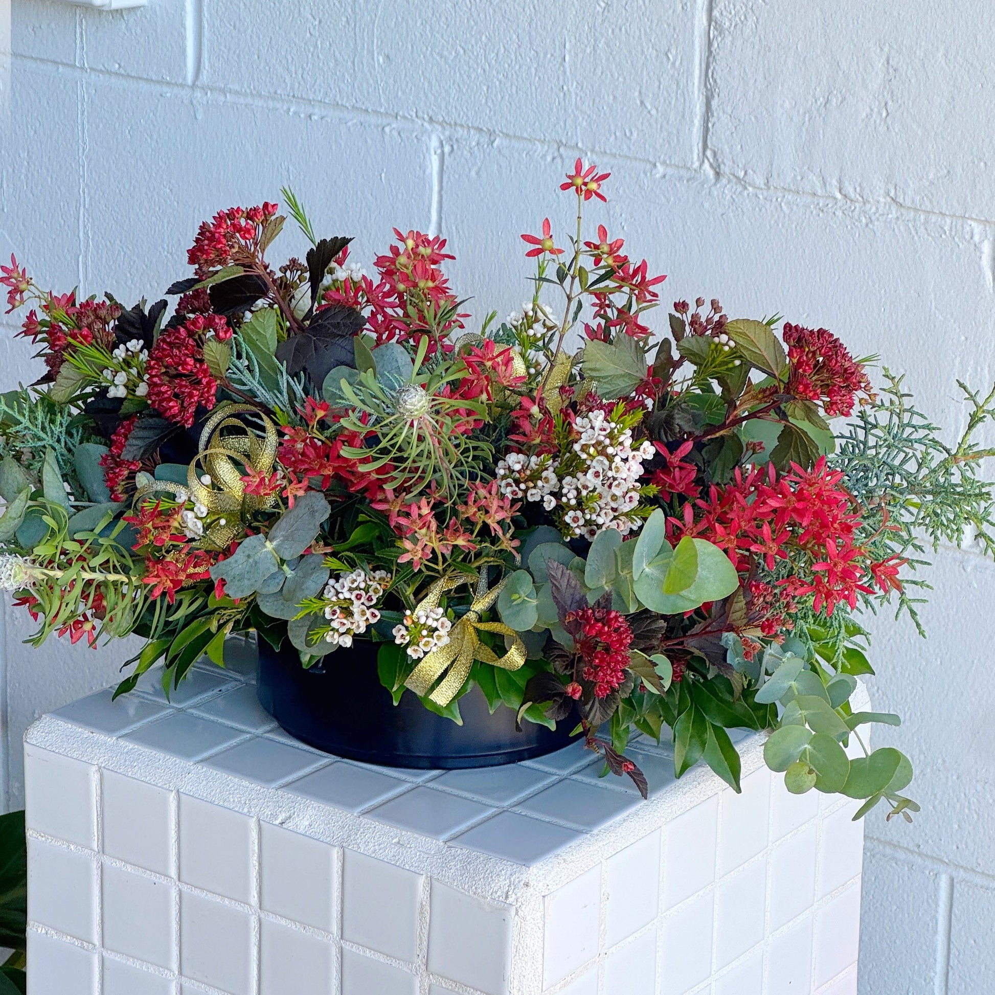 Celebrate an Australian Christmas with our stunning Native Christmas Table Bowl. Bursting with vibrant native foliage and rich seasonal reds, this arrangement brings a fresh, earthy take on festive styling. Designed low and full for the perfect table centrepiece, it features long-lasting textures and natural movement, accented with subtle gold touches for a hint of Christmas sparkle. Each bowl is crafted using fresh, locally sourced natives, making every piece unique while always embracing classic Christmas colour tones. A beautiful way to add a relaxed, native-inspired festive feel to any space.