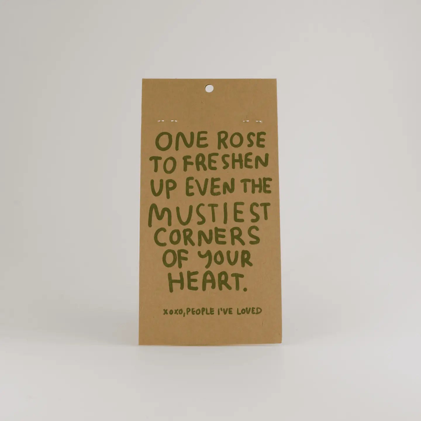 An air freshener for any space that needs a little love and freshening up. Put it in your home, car or workplace for a hint of rose in the air.